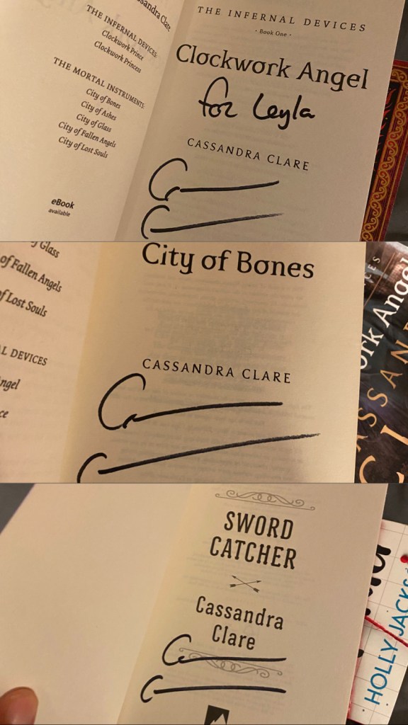 Following the question and answer sessions, we then were able to speak to Clare individually and get our books signed. Being allowed one book personalized and two signed was so exciting, but with such a huge backlog of books to choose from, how did I decide? Well, whilst The Mortal Instruments is the first series she wrote and that I read, The Infernal Devices is my favourite series of hers so far, so the first book in that series – Clockwork Angel – is the one I chose to have signed and dedicated to me. Furthermore, whilst The Mortal Instruments is not my favourite series of hers, City of Bones is the first book in the Shadowhunter universe in publication order and the book that kickstarted my love for this world and Clare as an author, so that is the second book I took to get signed. Finally, as it was a Sword Catcher event, I felt it only fitting to get my copy of Sword Catcher signed.