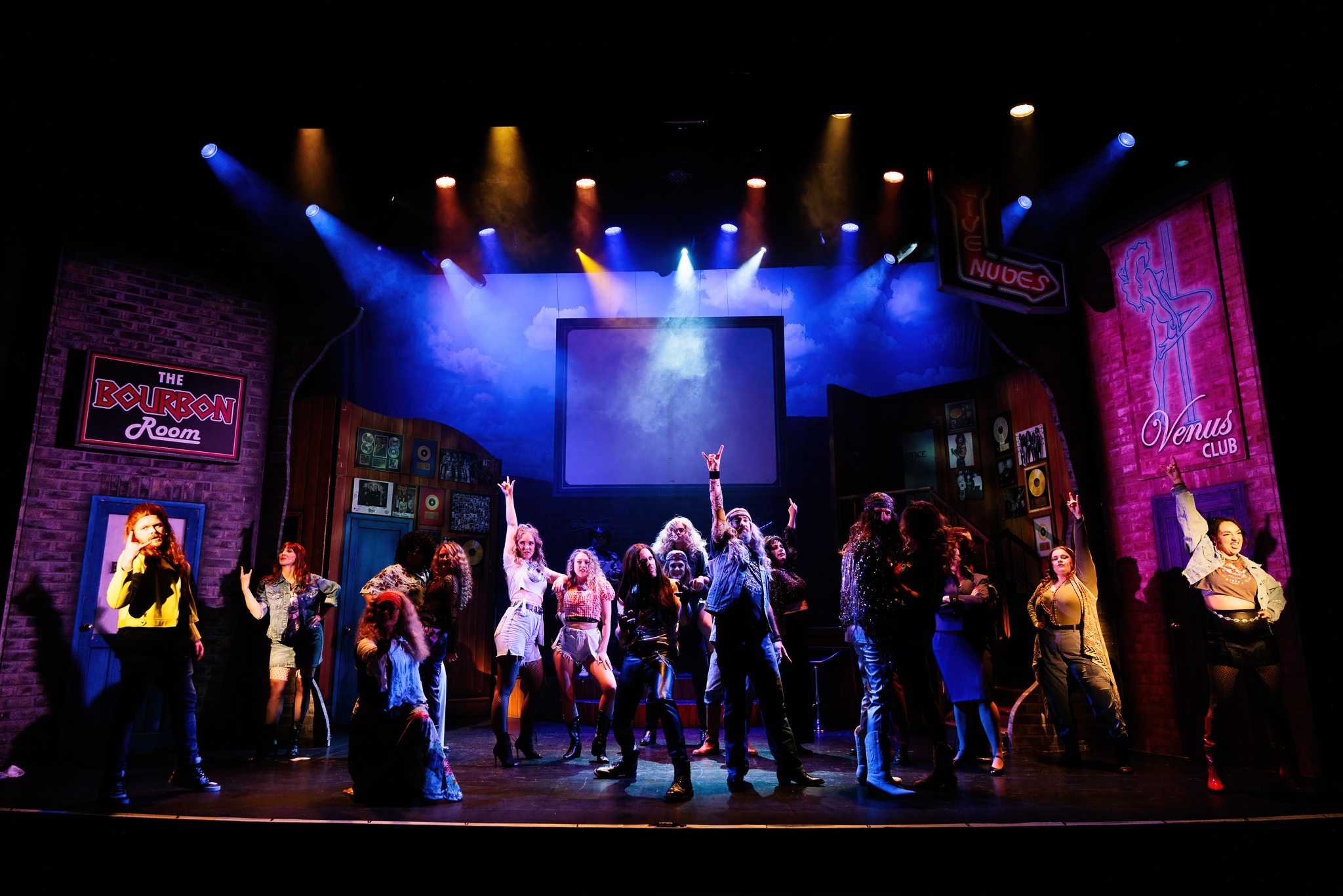 When I saw the rehearsal, I said I couldn’t wait to see the show with all the finished details bringing everything together, and BATS did not disappoint. The choreography from dance captain Harriet Brannam is perfect with not a step out of place; it is lively, provocative and exuberant – sometimes all at once! The costumes are all things 80s; think tight clothes, cowboy boots, lots of glitter and fringe – camp and iconic. The costumes, set and lights may all be minor details, but they all add up to transform the Haymarket Theatre and transport audiences to the Sunset Strip, all from the comfort of their seats.